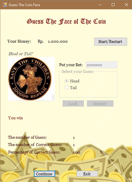 A classic guess coin face game (Heads or Tails) that is developed using C#. Players can choose coin faces and place bets.
